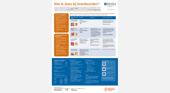 Op de poster staan de 5-punts anamnese, het 5-punts lichamelijk onderzoek en een overzicht voor inschatting van de diepte van de brandwond met daarbij de behandelopties en controlemomenten. Ook de methode voor inschatting van percentage totaal verbrand lichaamsoppervlak (TVLO), de verwijscriteria, afwijkend beloop en nazorg staan op de poster. Evenals QR-codes voor meer informatie en de telefoonnummers van de 3 brandwondencentra.