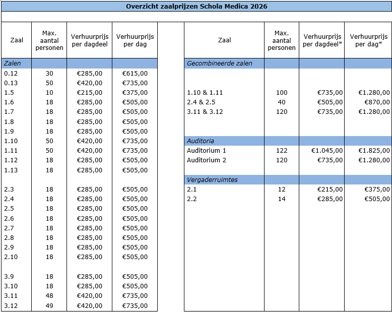 De tarieven voor zaalhuur gelden per dagdeel van 4 uur.